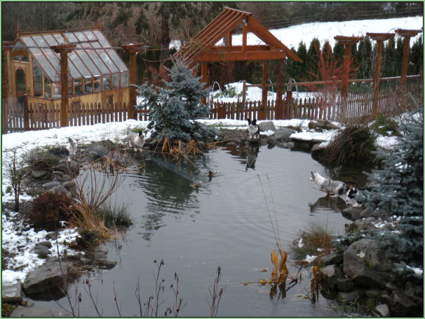 Rocky, and Geisha herding ducks on the koi pond. Moments after this photo was taken, Geisha leapt into the water and the ducks took flight. Fun Cardi games! |